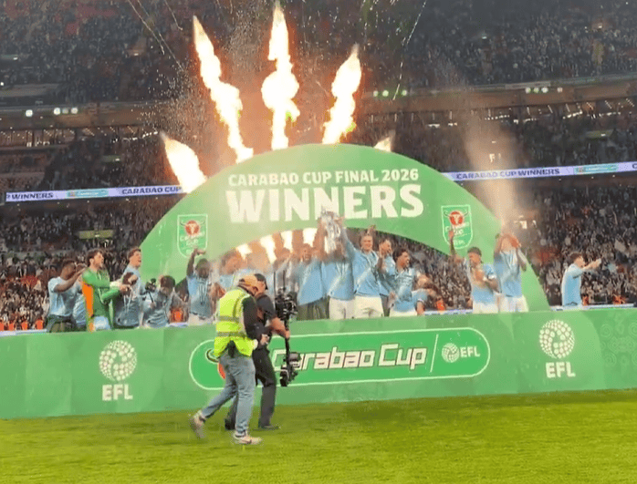 烟火冲向天空,曼城众将在领奖台前举起奖杯庆祝夺冠