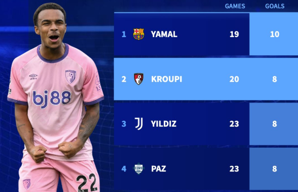 本赛季五大联赛进球最多的U21球员:亚马尔居首,克鲁皮在列