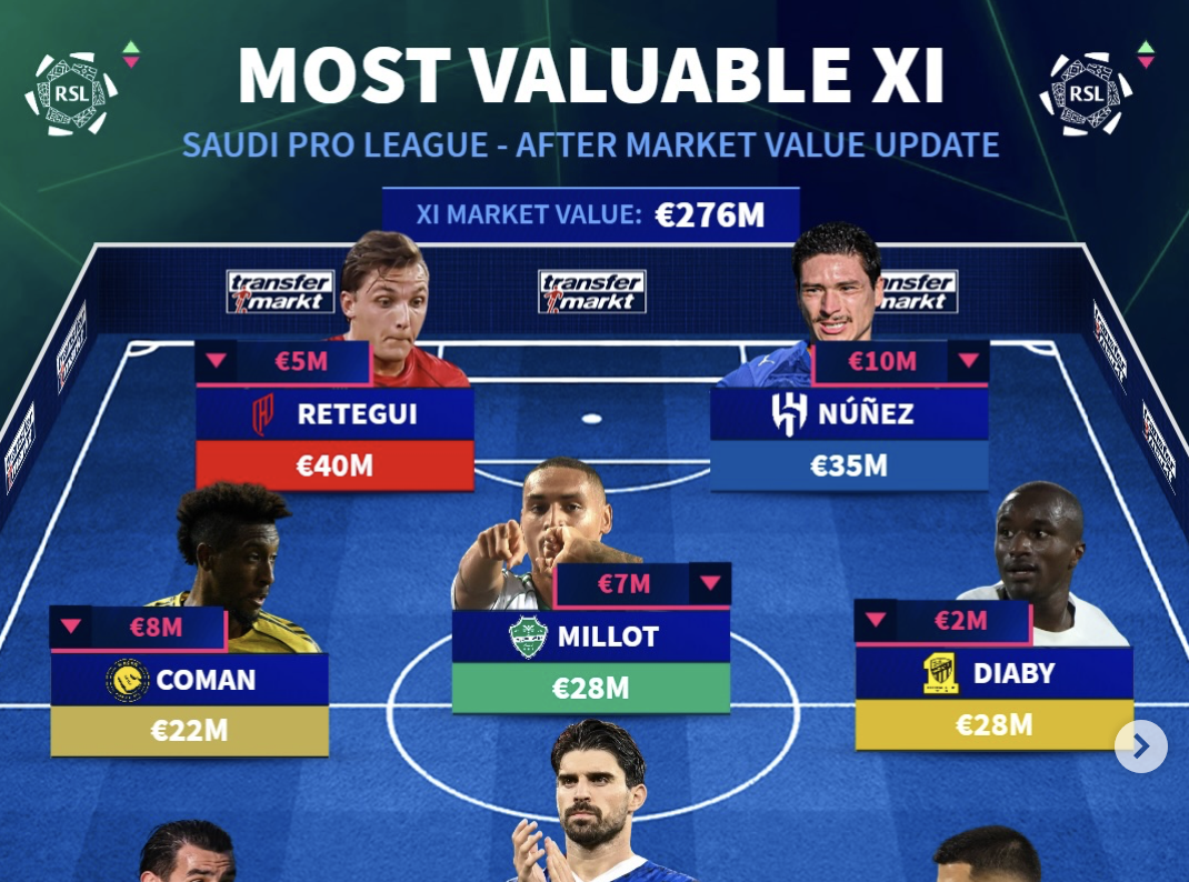 沙特联赛身价最高阵容:雷特吉领衔2.76亿欧十一人