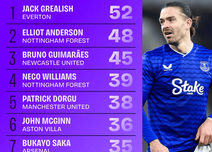 本赛季英超被犯规次数:格拉利什52次居首,安德森48次第二