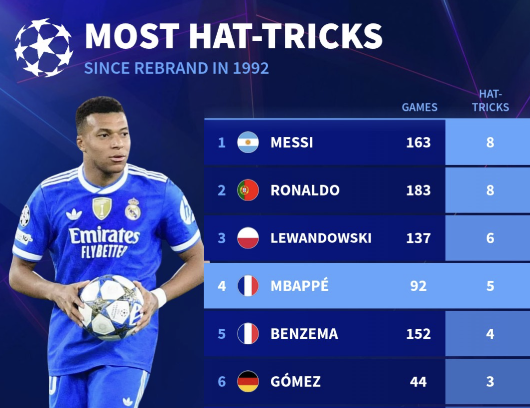 欧冠单场为西班牙球队打进4+球,姆巴佩是梅罗之后第三位
