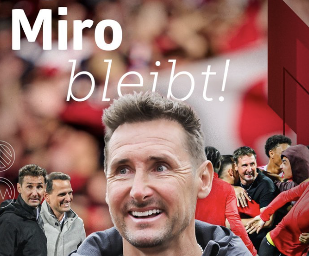 纽伦堡官方:与主帅克洛泽续约;后者自2024年起执掌球队