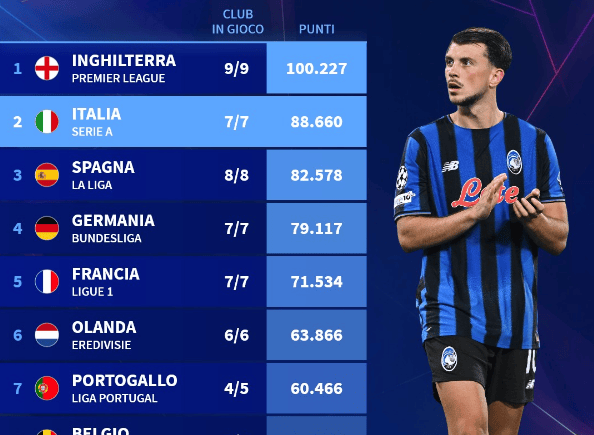 各国联赛近5个赛季欧战积分:英超100分居首,意甲、西甲前3