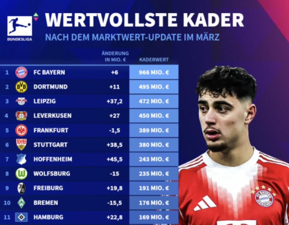 德甲球队身价榜:拜仁9.66亿断层领先;多特4.95亿排名第二