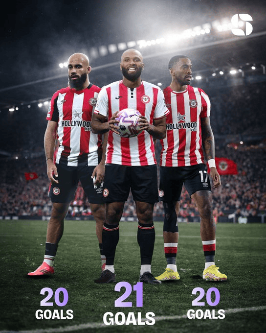 2021年以来,布伦特福德是英超唯一有3位单季20+射手的球队