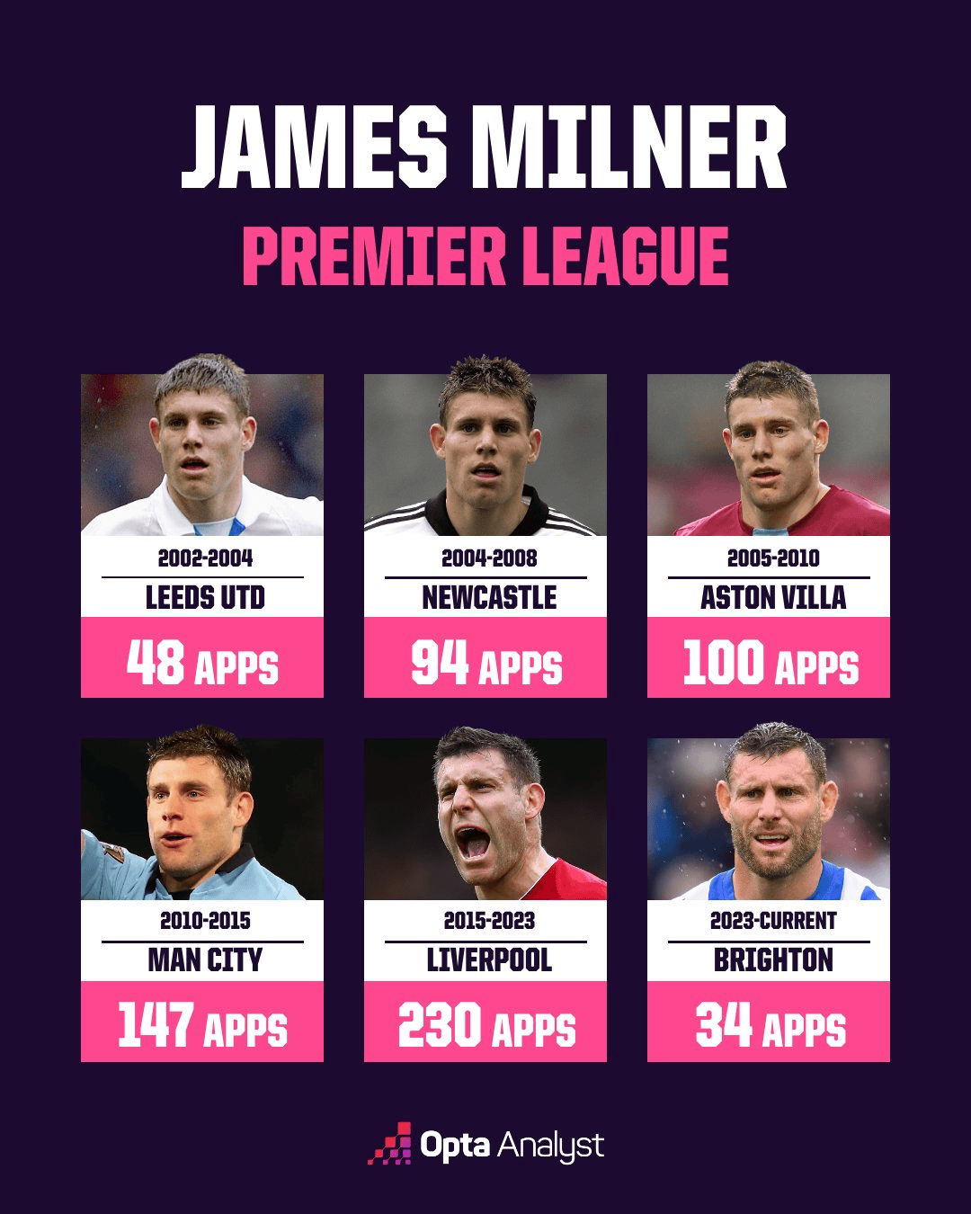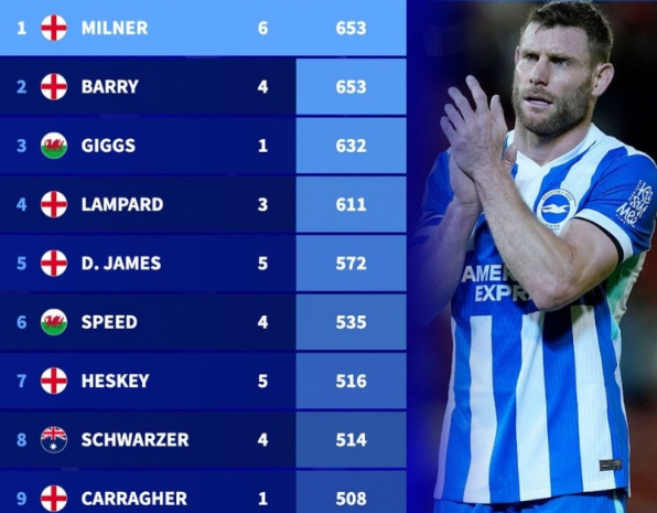 英超历史出场榜:米尔纳、巴里653场并列居首,吉格斯第三