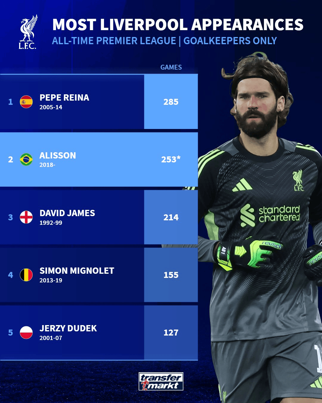 利物浦队史门将英超出场榜:雷纳285场居首,阿利松253场第2