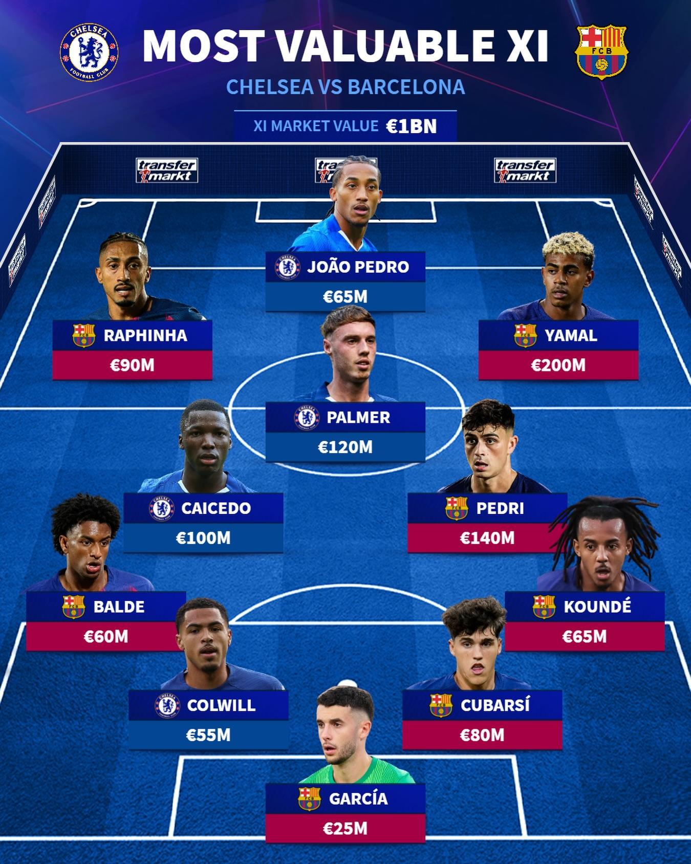 德转盘点巴萨切尔西合体身价最高阵容:亚马尔、凯塞多领衔