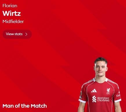 收获英超首球!利物浦官方:维尔茨当选2-1狼队队内最佳球员