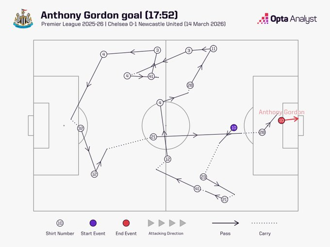 纽卡制胜切尔西的进球共有10人参与,仅沃尔特马德未触球