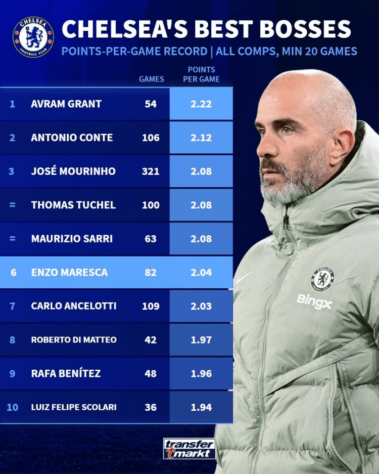 切尔西队史场均拿分榜:马雷斯卡升至第6,格兰特居首