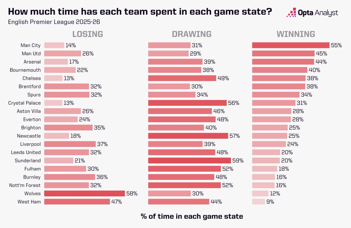 曼城本赛季在英超领先时间占比最高,水晶宫落后占比最低