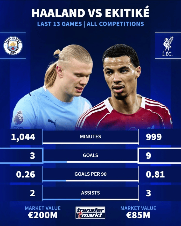 哈兰德、埃基蒂克近13场各项赛事表现:进球3-9,助攻2-3