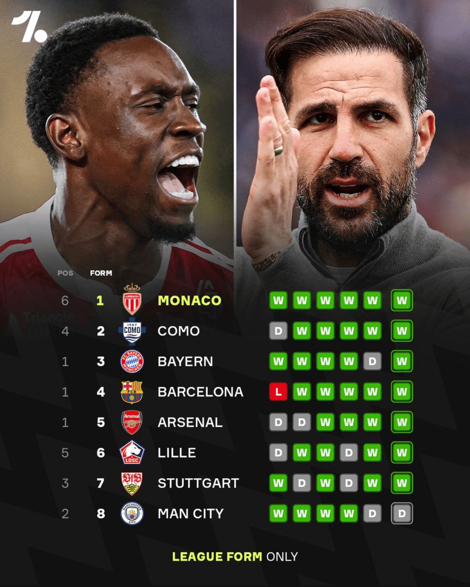 五大联赛状态榜:摩纳哥6连胜第一,科莫第二,拜仁巴萨三四