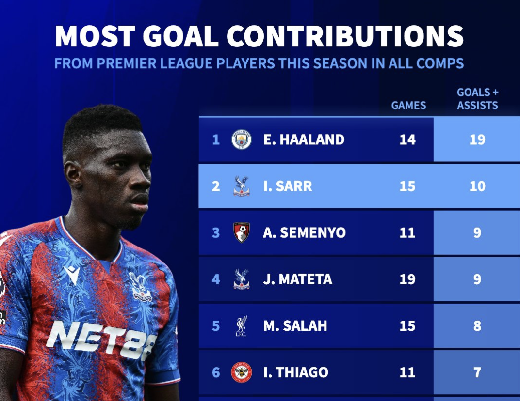 本赛季各项赛事参与进球最多的英超球员:哈兰德19球居首