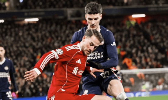 德里奥赫接传球,无人盯防打进死角,利物浦1-4埃因霍温
