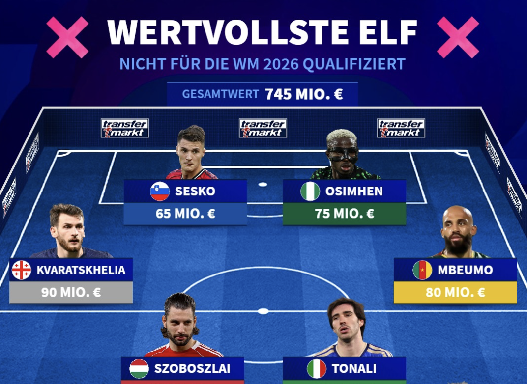 缺席本届世界杯球员最高身价阵容:索博/K77领衔7.45亿豪阵