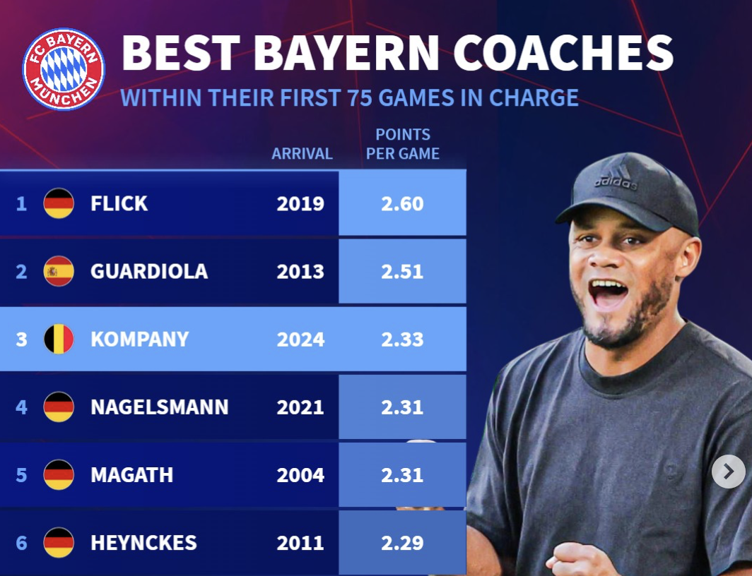 拜仁历任主帅前75场比赛场均得分榜:孔帕尼2.33分位居第三