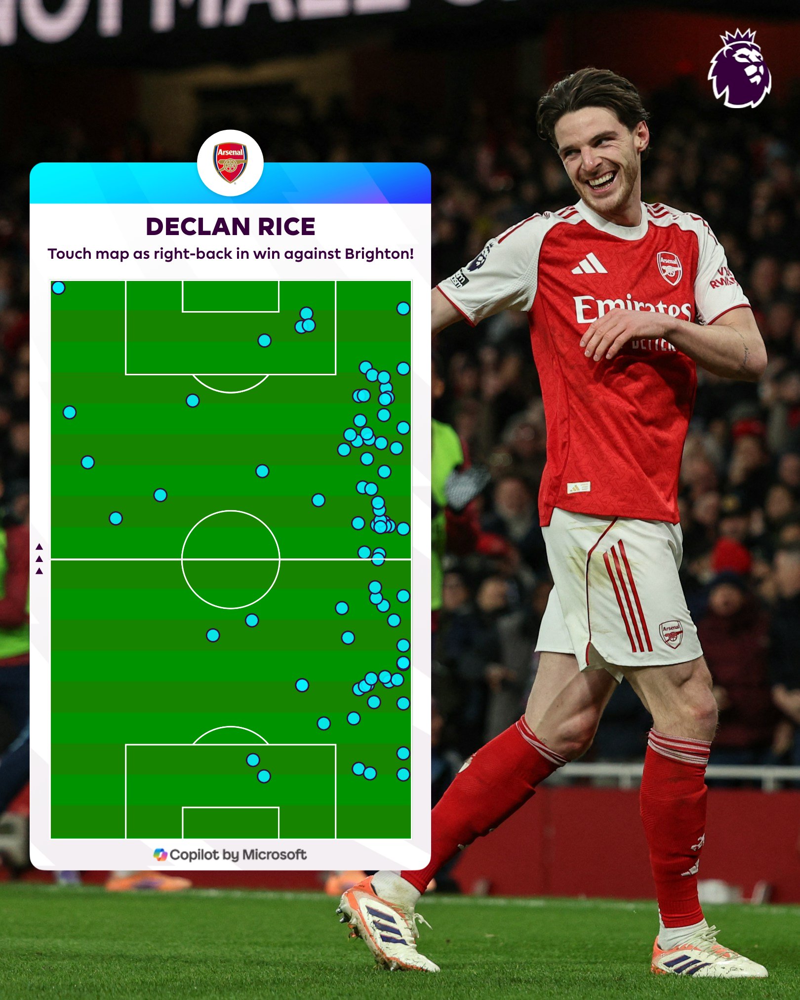 全能!英超官方晒赖斯客串右后卫热点图:覆盖一整条右边路