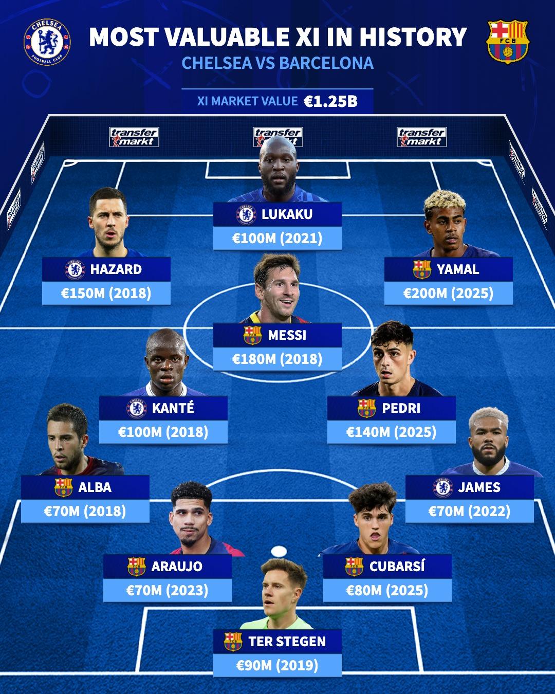切尔西+巴萨历史身价最高阵容:梅西领衔,坎特、阿扎尔在列