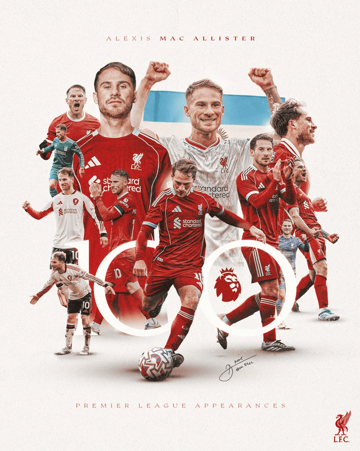 麦卡利斯特迎利物浦生涯英超百场里程碑,俱乐部发纪念海报