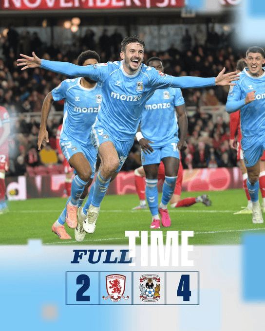 考文垂2分钟2球,4-2击败米堡;兰帕德率队17轮英冠领先10分