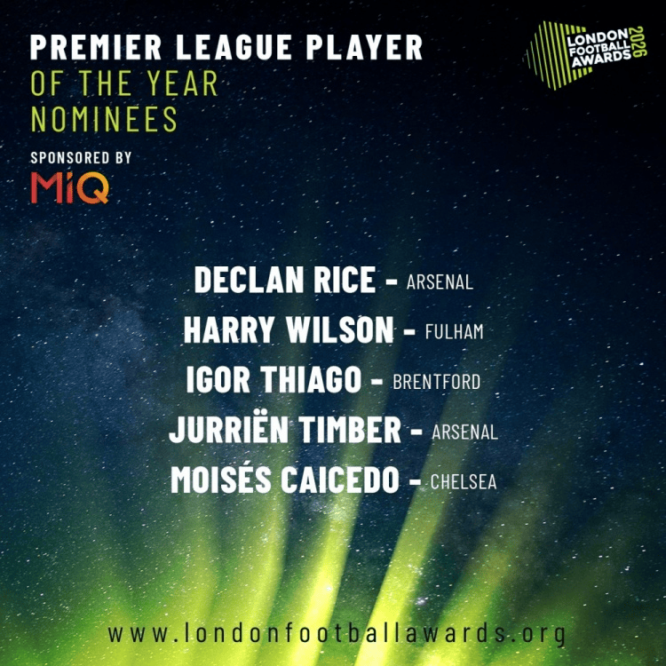 伦敦足球奖年度最佳英超球员候选:赖斯、廷贝尔、凯塞多等