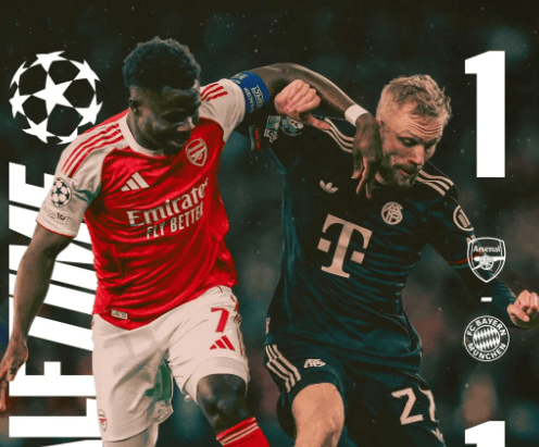 欧冠:阿森纳3-1拜仁,廷贝尔卡尔破门,枪手两替补建功