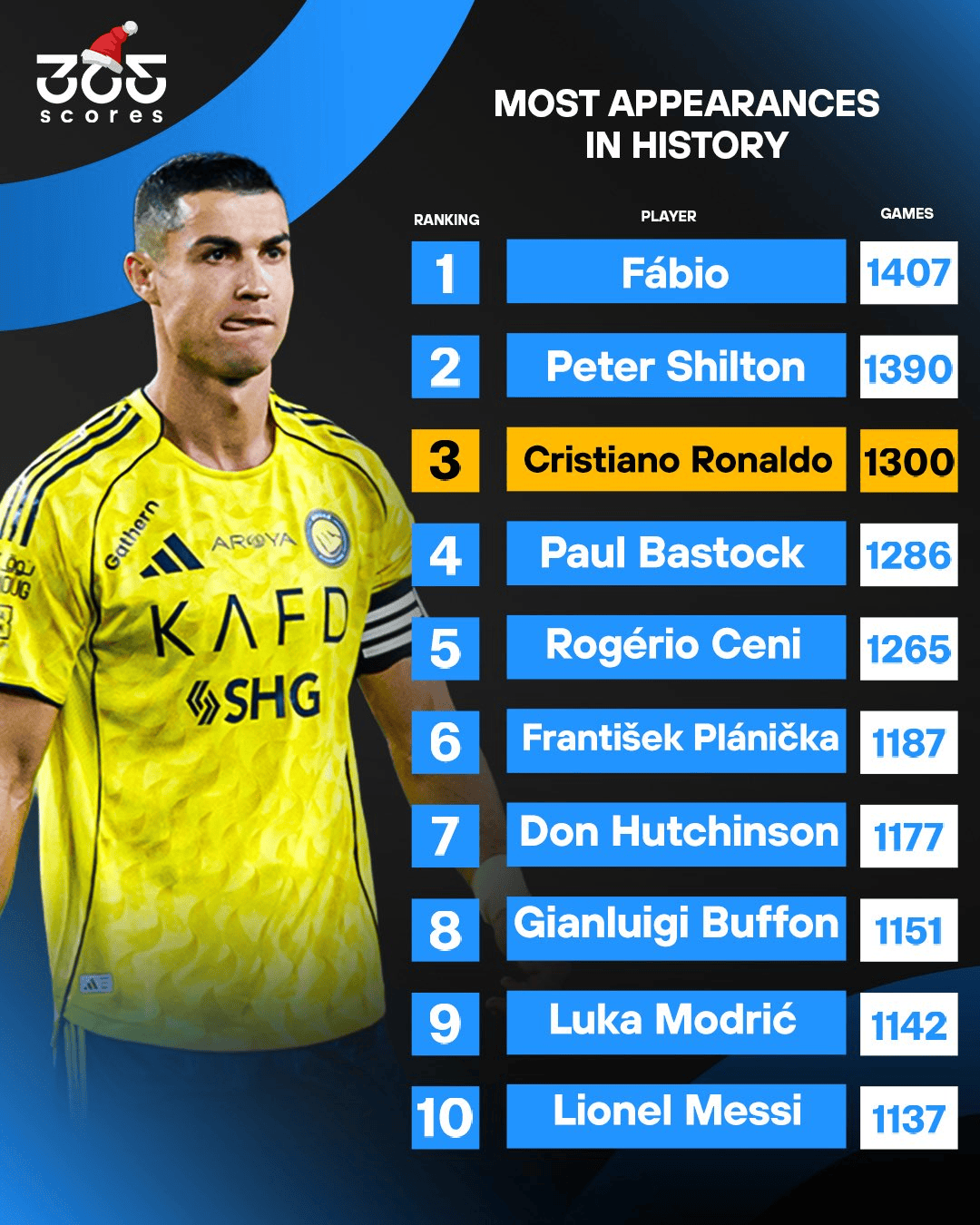 C罗职业生涯出场达1300场,足坛第三&非门将球员中出勤第一