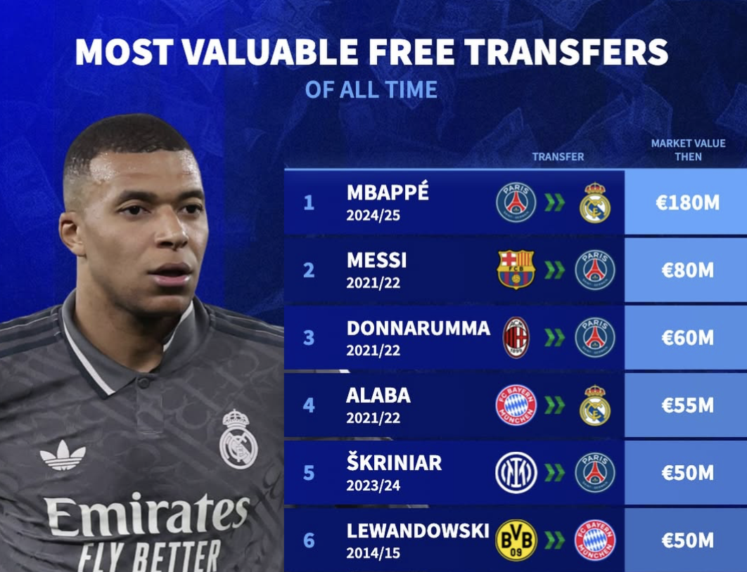 足坛免签时球员身价榜:姆巴佩1.8亿居首;梅西8000万第二