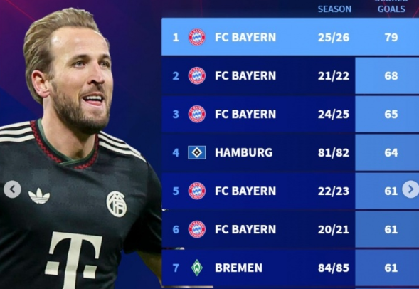 拜仁本赛季21轮德甲即轰入79球,创造赛事历史同期纪录