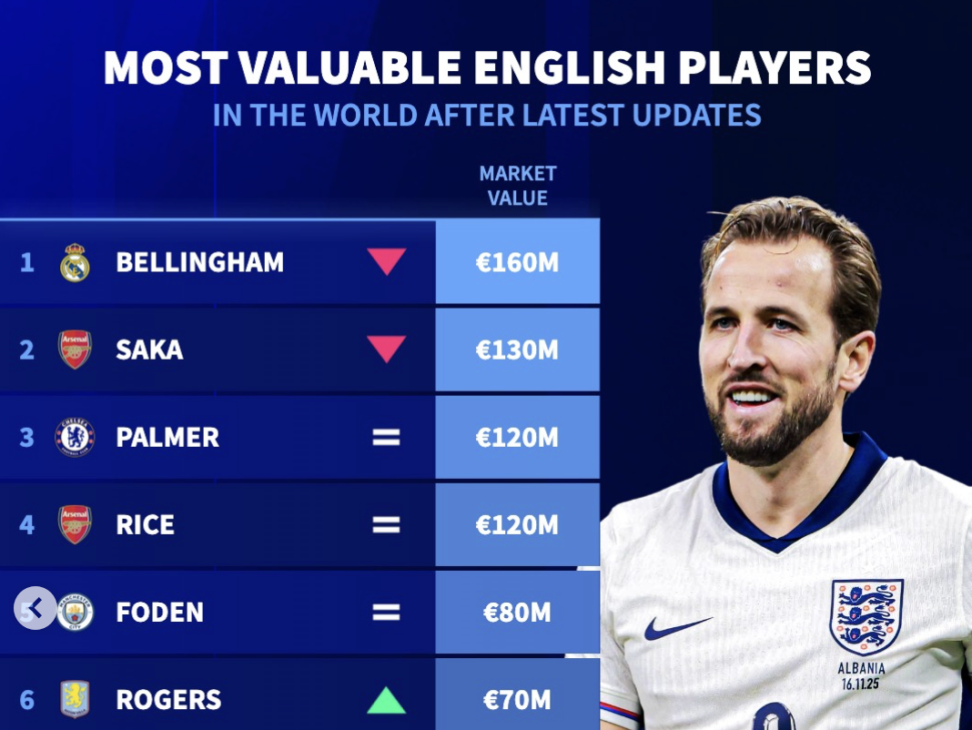 12月更新后英格兰球员身价:贝林、萨卡、帕尔默和赖斯超1亿