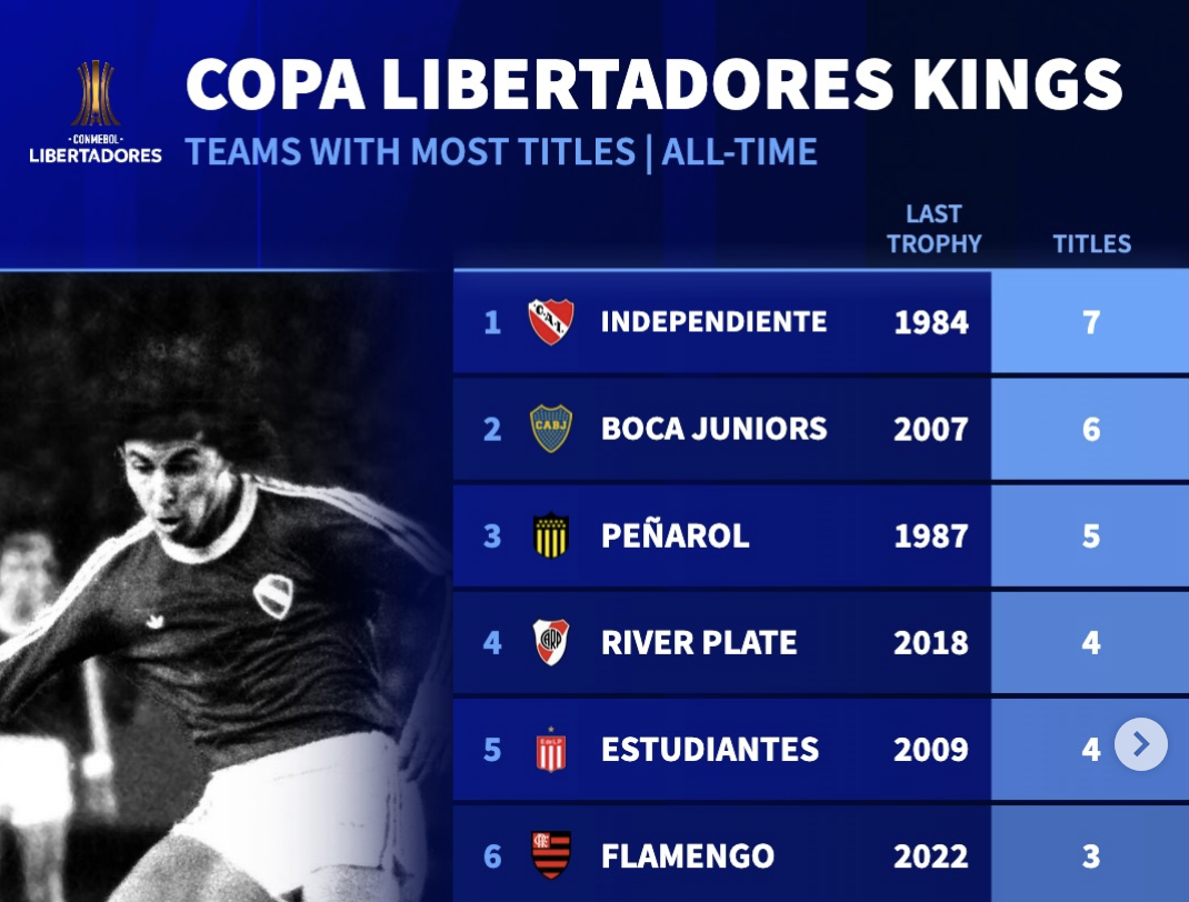南美解放者杯夺冠次数榜:独立队7次居首;博卡青年排第二