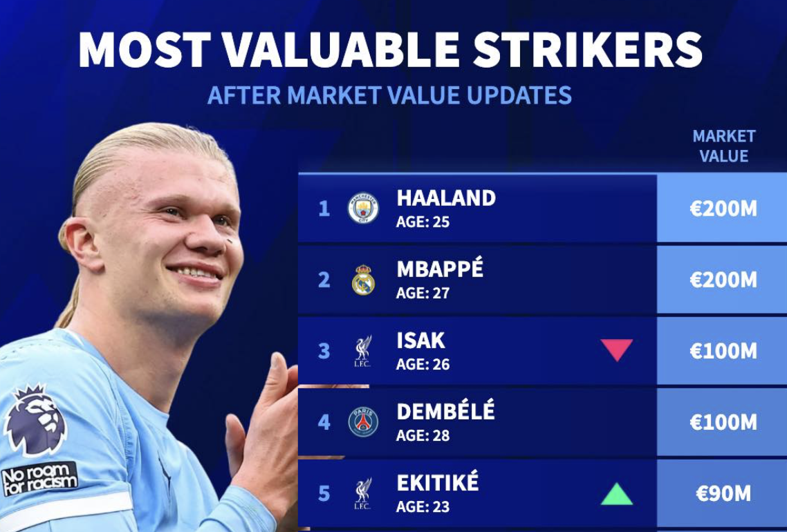 足坛中锋身价榜:哈兰德、姆巴佩、伊萨克和登贝莱排前四