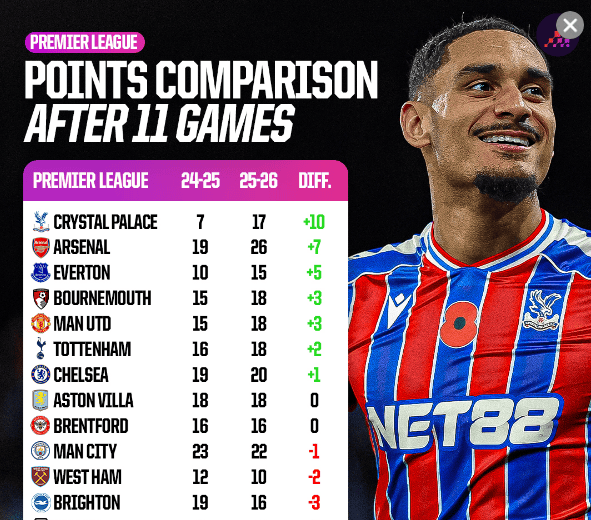 英超球队本赛季前11轮积分较上赛季同期:水晶宫+10分最多