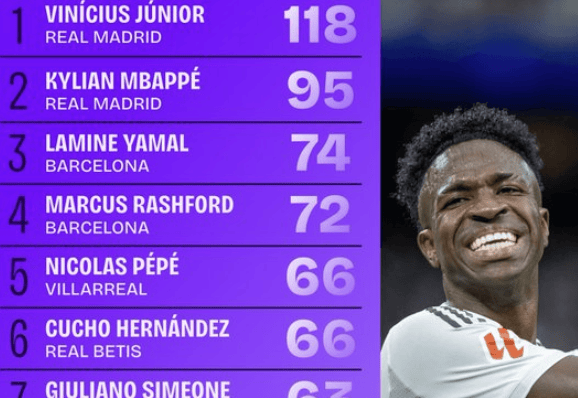 西甲本赛季禁区触球榜:维尼修斯、姆巴佩、亚马尔分列前三