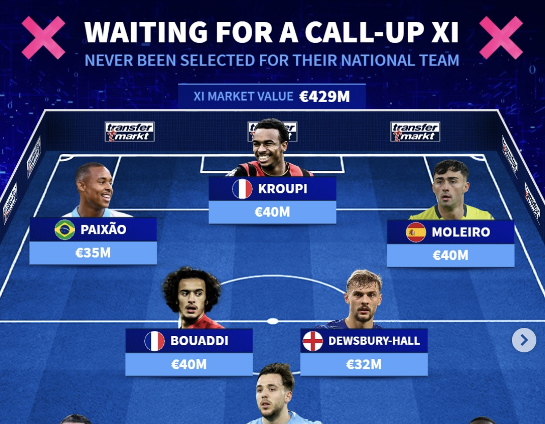 从未入选国家队的最高身价阵容:A费6000万领衔4.29亿阵容