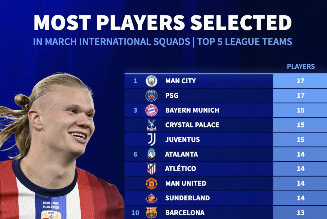 国脚数最多五大联赛球队榜:曼城和巴黎各17名排并列第一