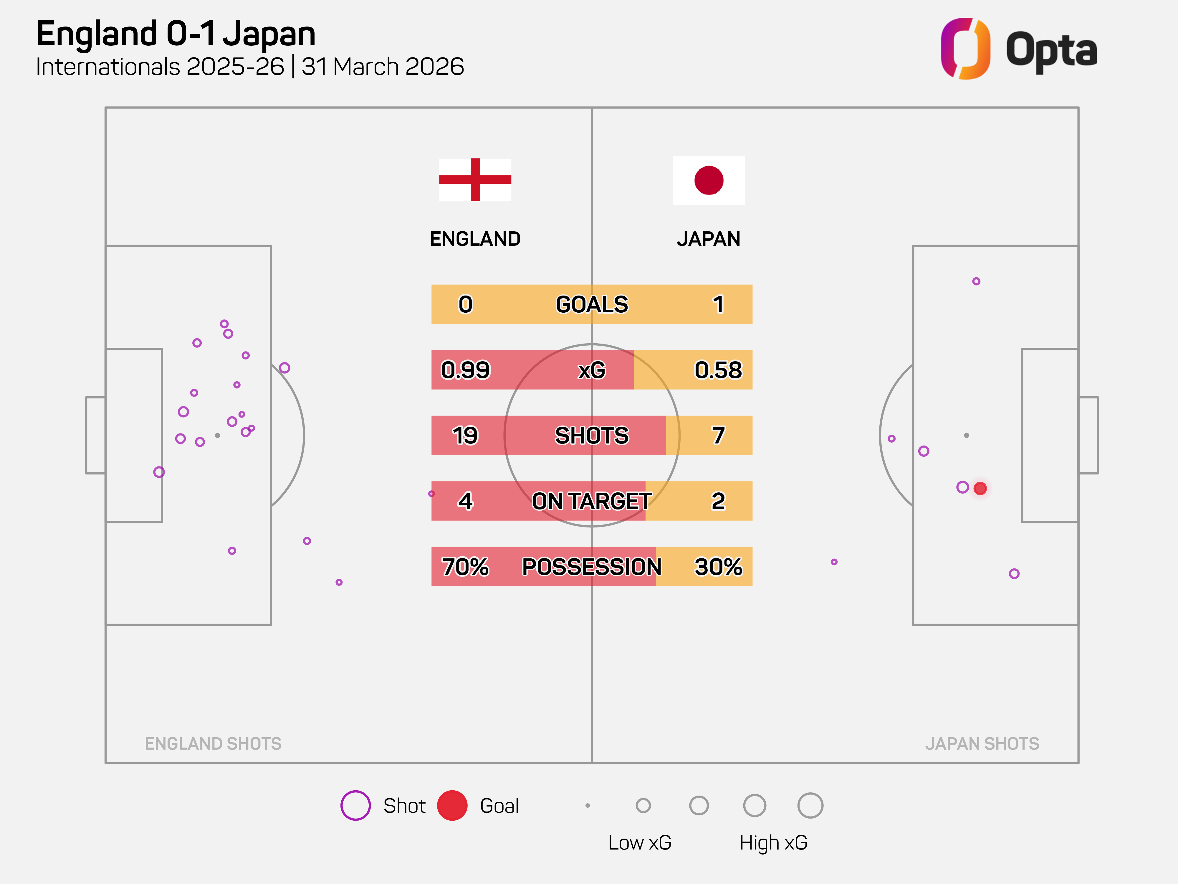 英格兰对日本射正4次,3次是最后15分钟通过角球完成的