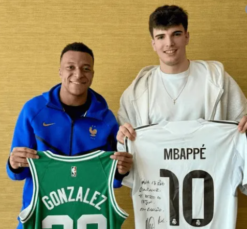 姆巴佩与凯尔特人后卫雨果-冈萨雷斯合影,并交换球衣