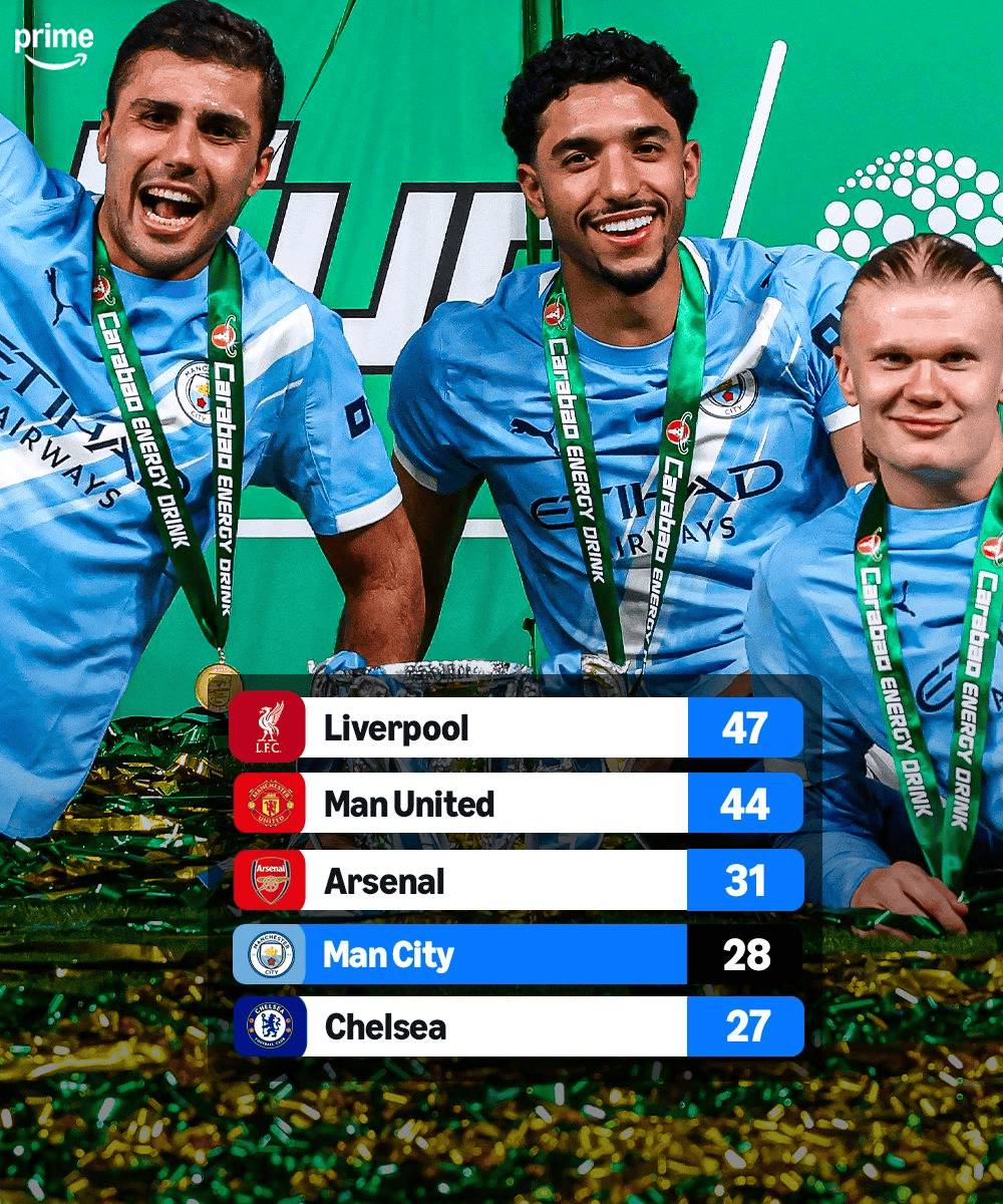 28冠!曼城队史主要冠军数升至英格兰第4,距阿森纳只差3冠