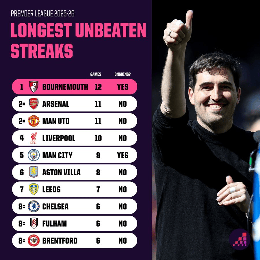 12场!伯恩茅斯是本赛季英超保持最长不败场次的球队