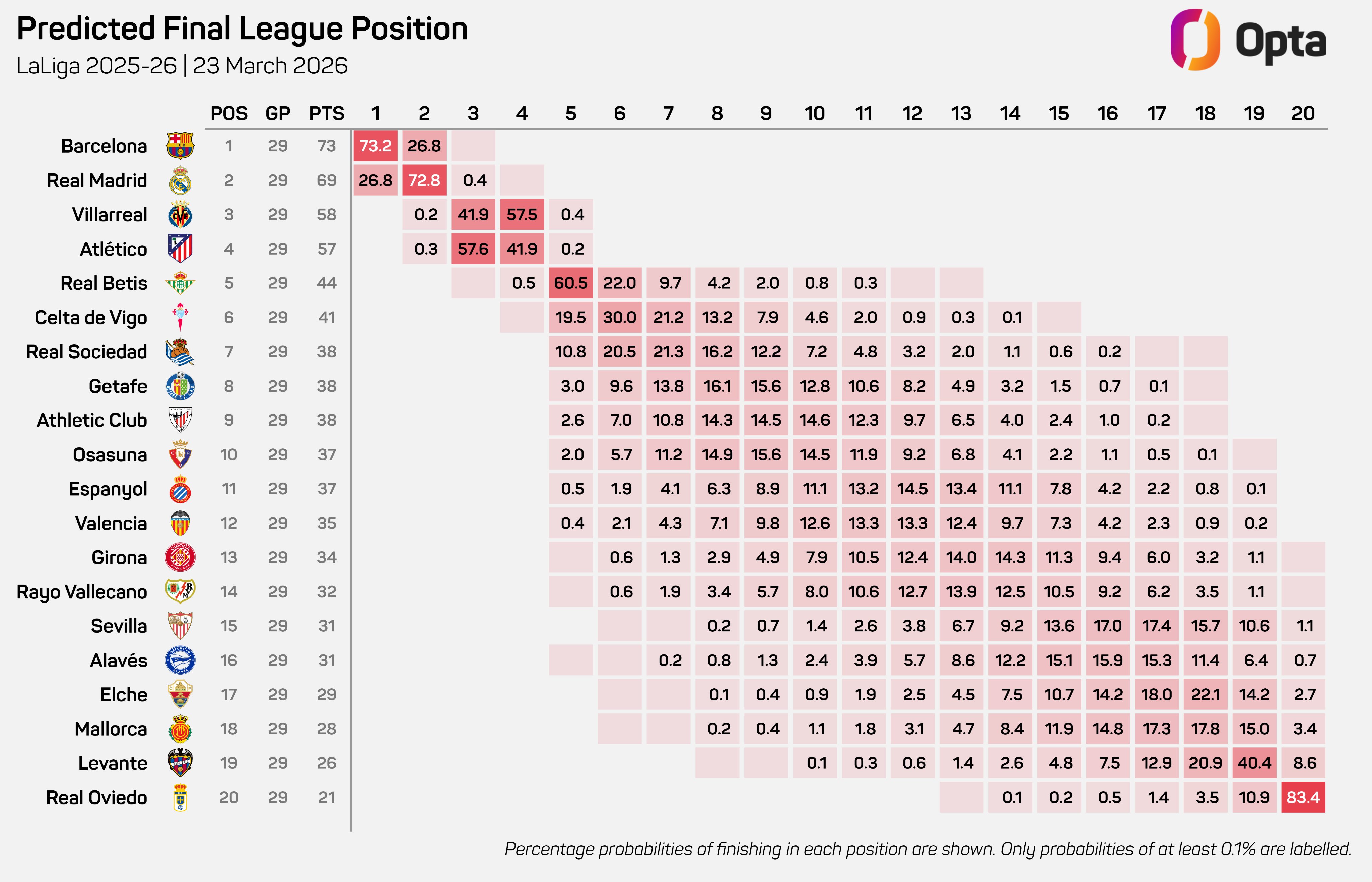 OPTA西甲排名预测:巴萨夺冠概率超7成,马竞力压黄潜夺第3