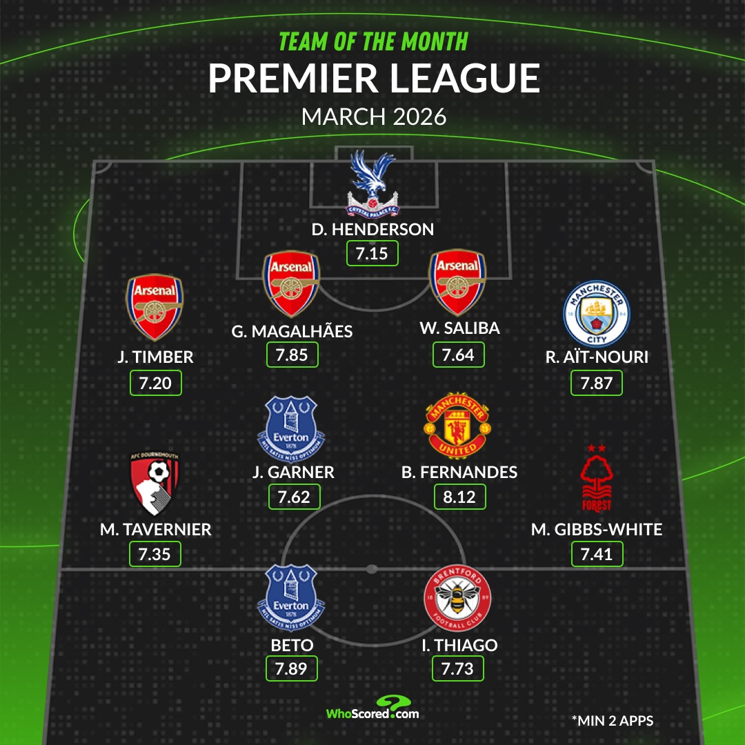 WS英超3月份评分最高阵容:B费领衔,阿森纳后防3将入选