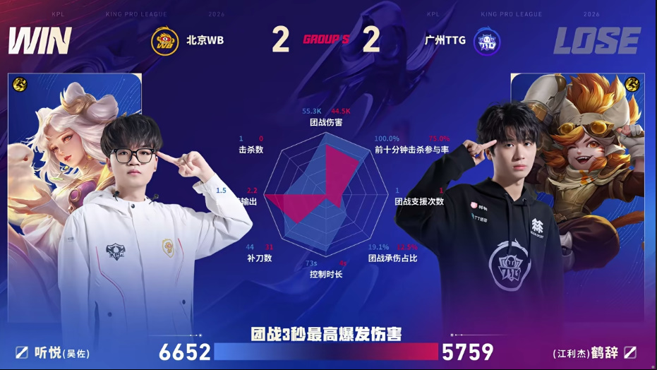 WB/TTG第四局数据图:听悦嫦娥控制/团战伤害多项拉满