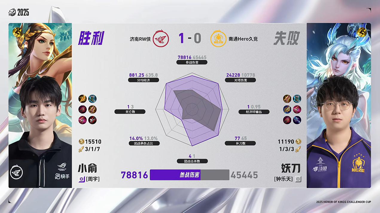 RW/Hero第1局数据对比:小俞虞姬全包围妖刀敖隐