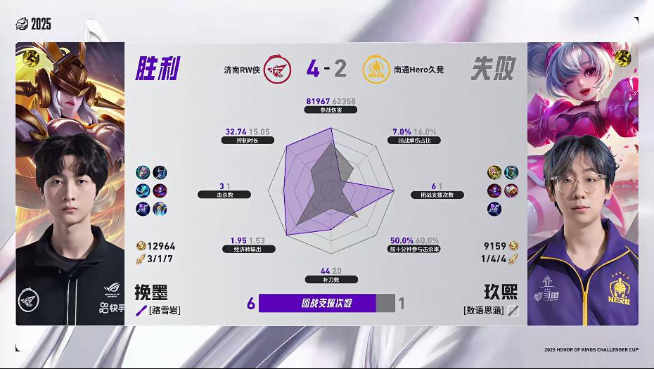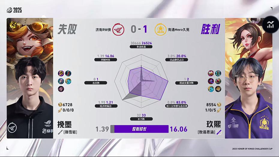 Hero/RW第一局数据图:玖熙不知火舞对位领先,两项数据拉满