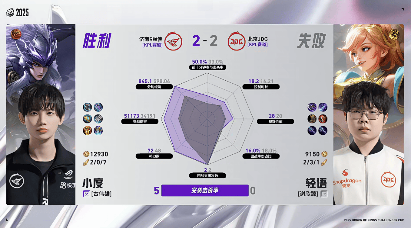 RW侠/JDG第七局数据对比:小俞公孙离对位多数据领先