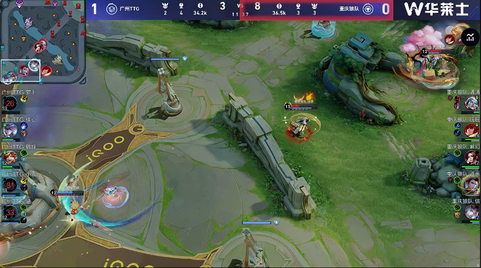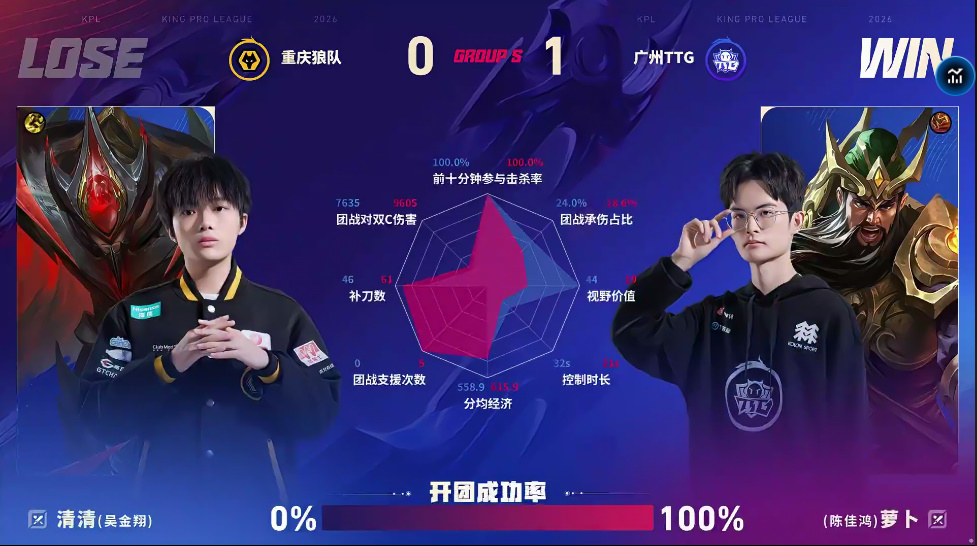 TTG/狼队第一局数据对比:萝卜关羽开团成功率高达百分百