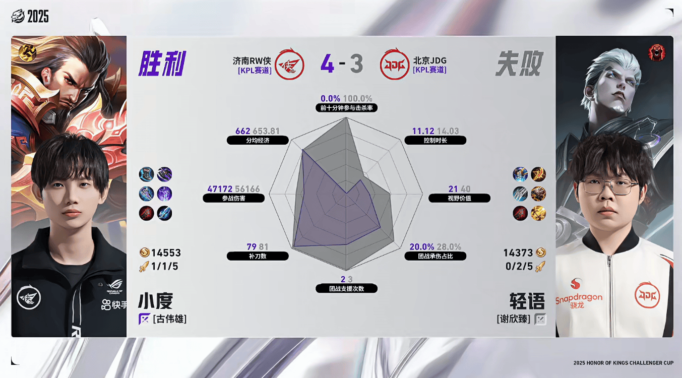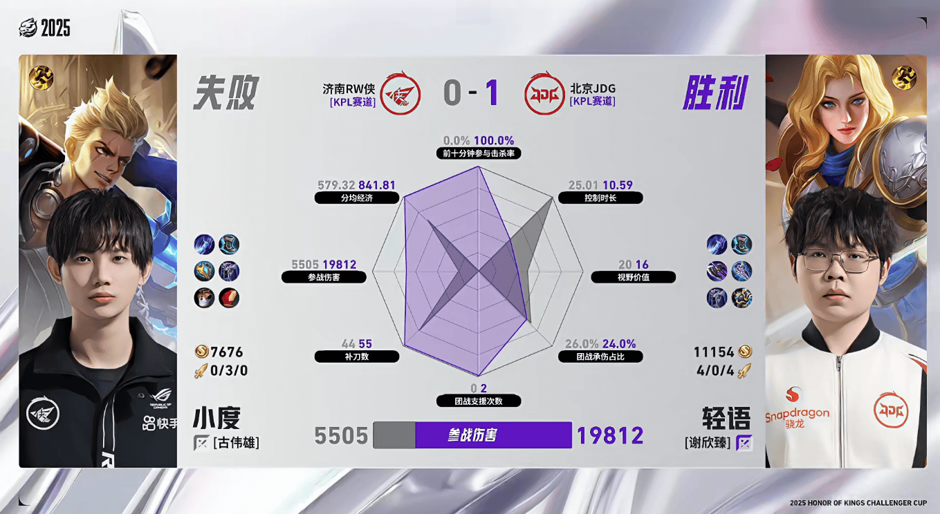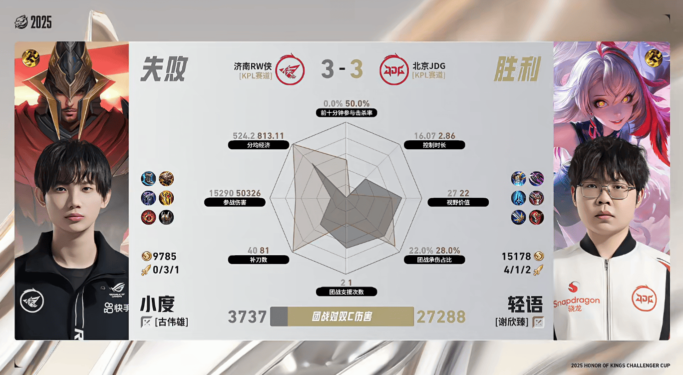 JDG/RW侠第一局数据对比:无双清融多数据领先对位